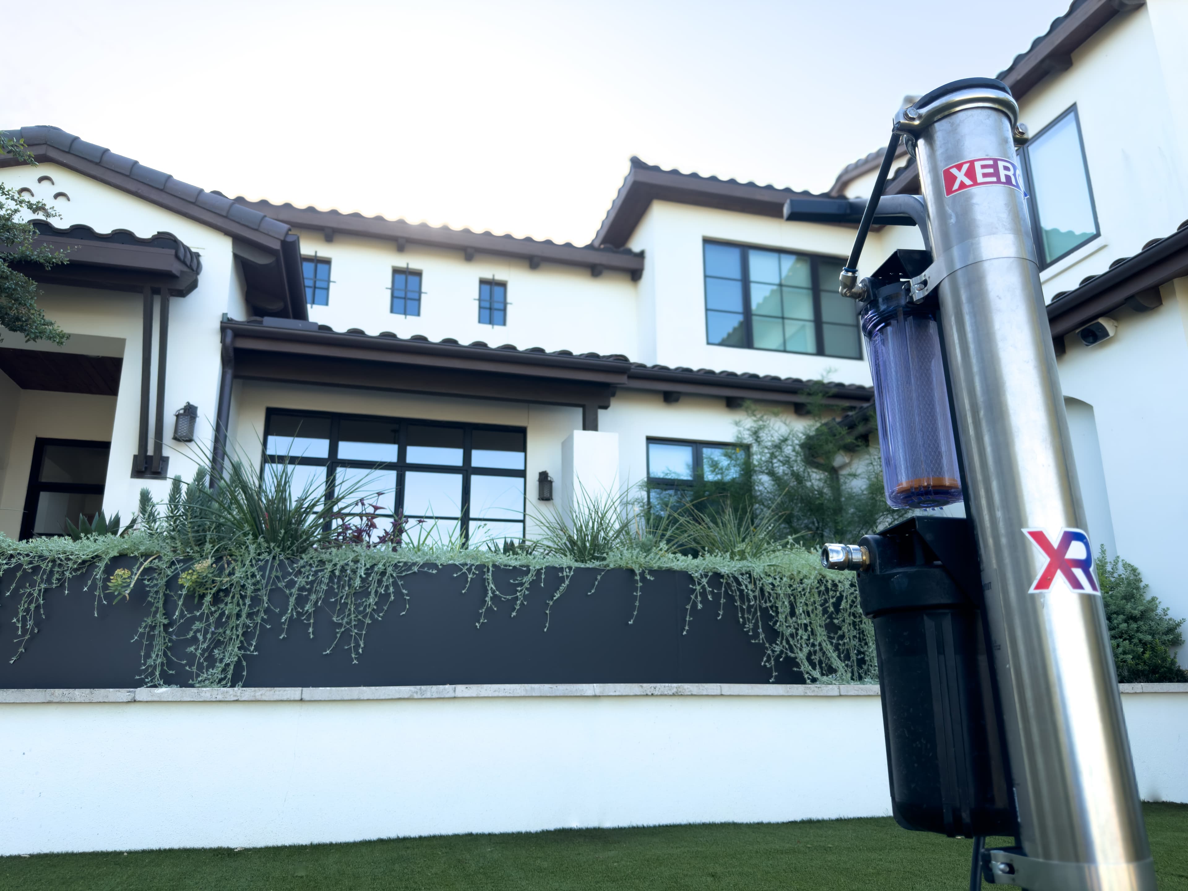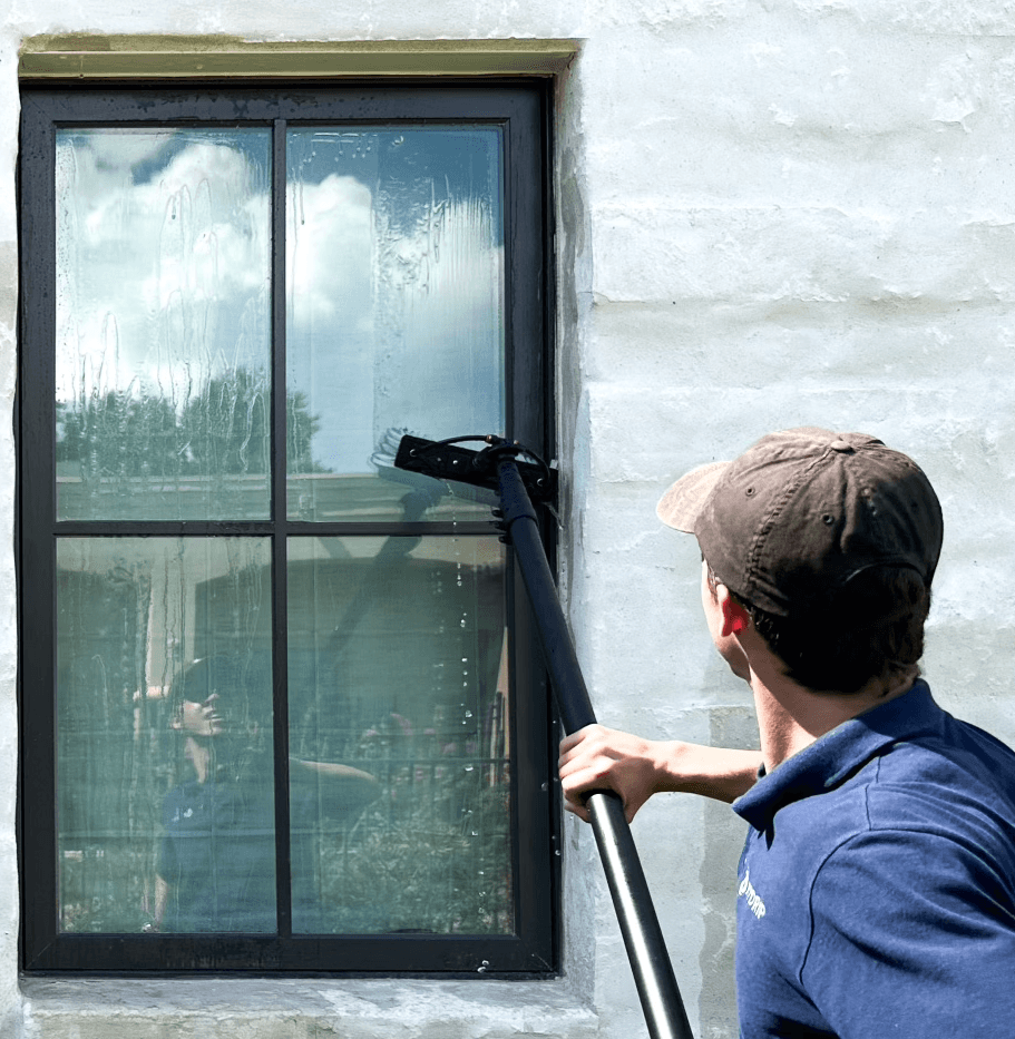 We use an extendable waterfed pole that reaches up to 30 feet. For tricky, high windows, we also have ladders to get the best angle.